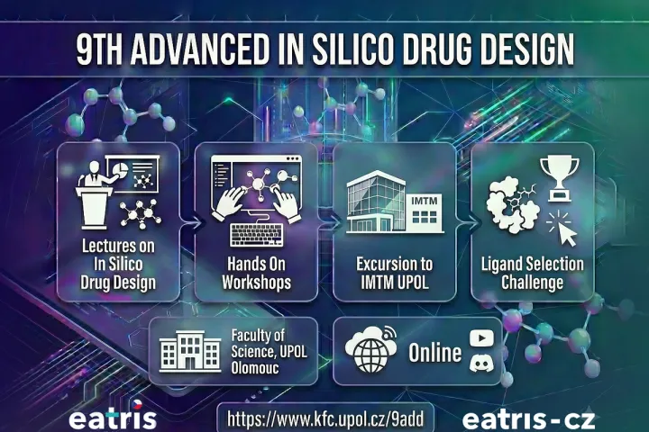 The 9ADD workshop (January 26–30, 2026) is an international hybrid event hosted by Palacký University Olomouc that focuses on modern in silico approaches to drug design, combining lectures and hands-on tutorials in structure-based and ligand-based drug discovery, including molecular docking, molecular dynamics, pharmacophores, QSAR, de novo design, and deep learning, delivered by leading experts from academia and industry.