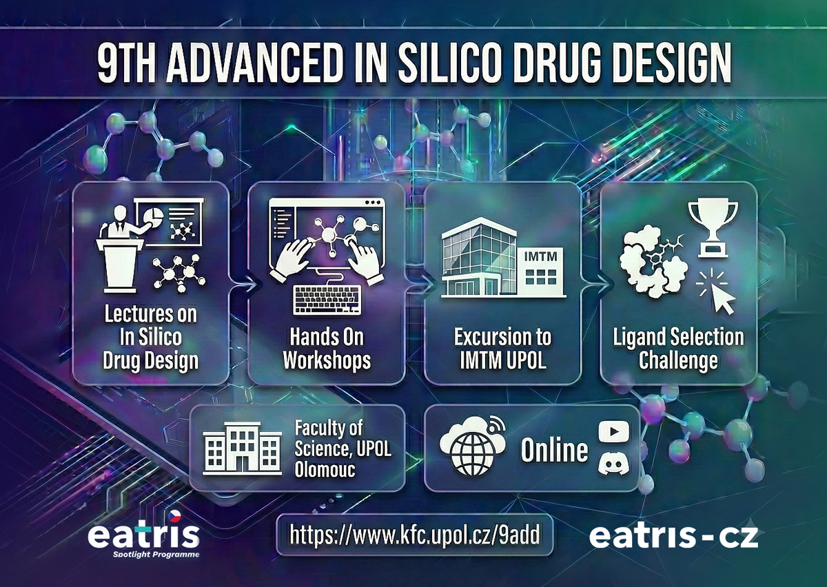 The 9ADD workshop (January 26–30, 2026) is an international hybrid event hosted by Palacký University Olomouc that focuses on modern in silico approaches to drug design, combining lectures and hands-on tutorials in structure-based and ligand-based drug discovery, including molecular docking, molecular dynamics, pharmacophores, QSAR, de novo design, and deep learning, delivered by leading experts from academia and industry.