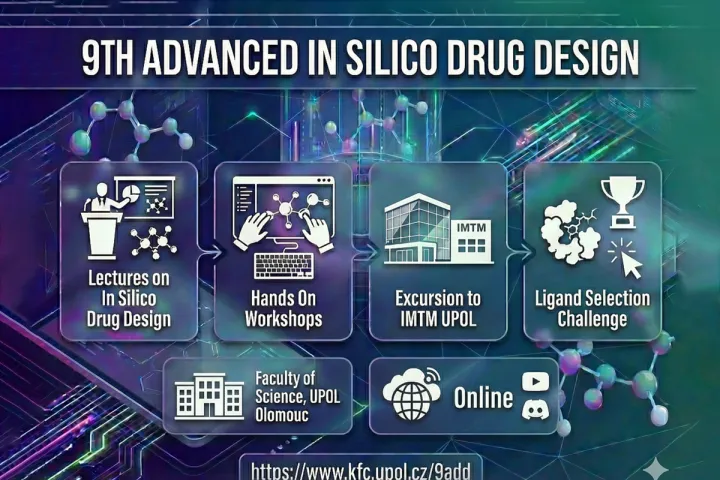 The 9ADD workshop (26–30 January 2026) is an international hybrid event hosted by Palacký University Olomouc that focuses on modern in silico approaches to drug design, combining lectures and hands-on tutorials in structure-based and ligand-based drug discovery, including molecular docking, molecular dynamics, pharmacophores, QSAR, de novo design, and deep learning, delivered by leading experts from academia and industry.